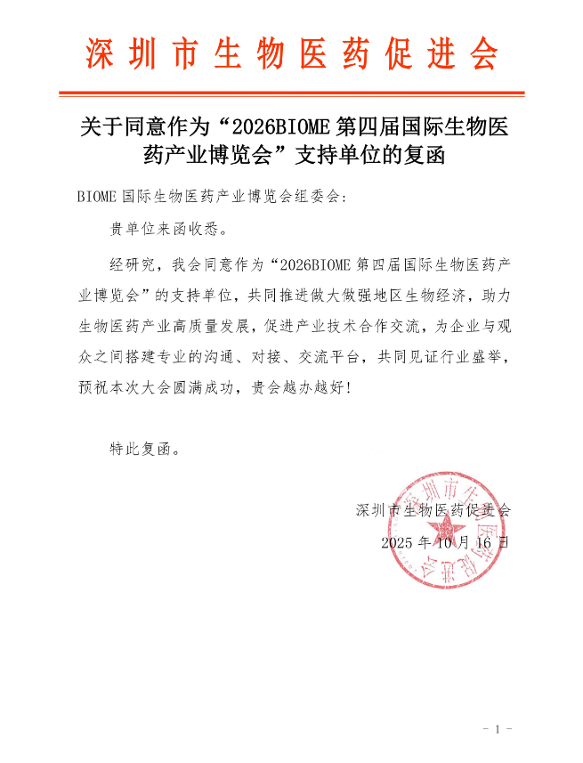 热烈感谢:深圳市生物医药促进会作为BIOME2026北京生物医药展支持单位的复函